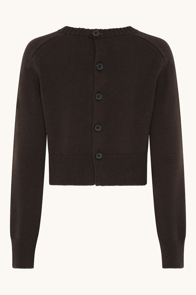 CARO is our cropped knit jumper. Designed with a relaxed fit and clean lines, it’s made from soft British cashmere using Loro Piana yarn, crafted in Mongolia. It features buttons at the back for a subtle detail. Can also be worn reversed as a playful cardigan.