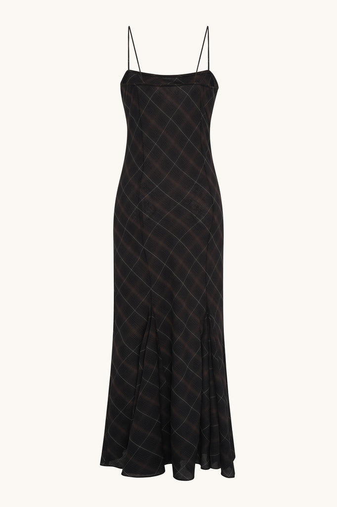 LARA is our slip dress. Designed with thin straps and a soft square neckline, it features a fitted bodice and flared hem for easy movement. Made from lightweight Japanese voile in black check, it drapes fluidly for a flattering silhouette. Can be styled from day to night.