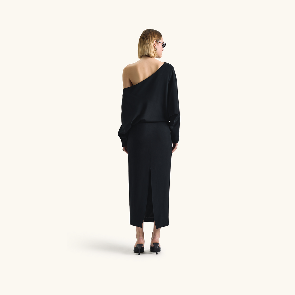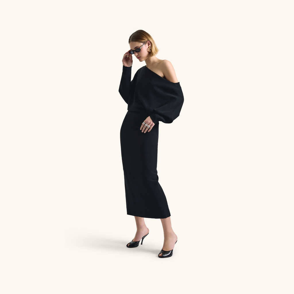 The DALIA dress in black offers a refined, sculptural take on evening elegance. Crafted in smooth crepe, it features a clean, off-the-shoulder silhouette that highlights the neckline while maintaining a structured, flattering fit through the body.