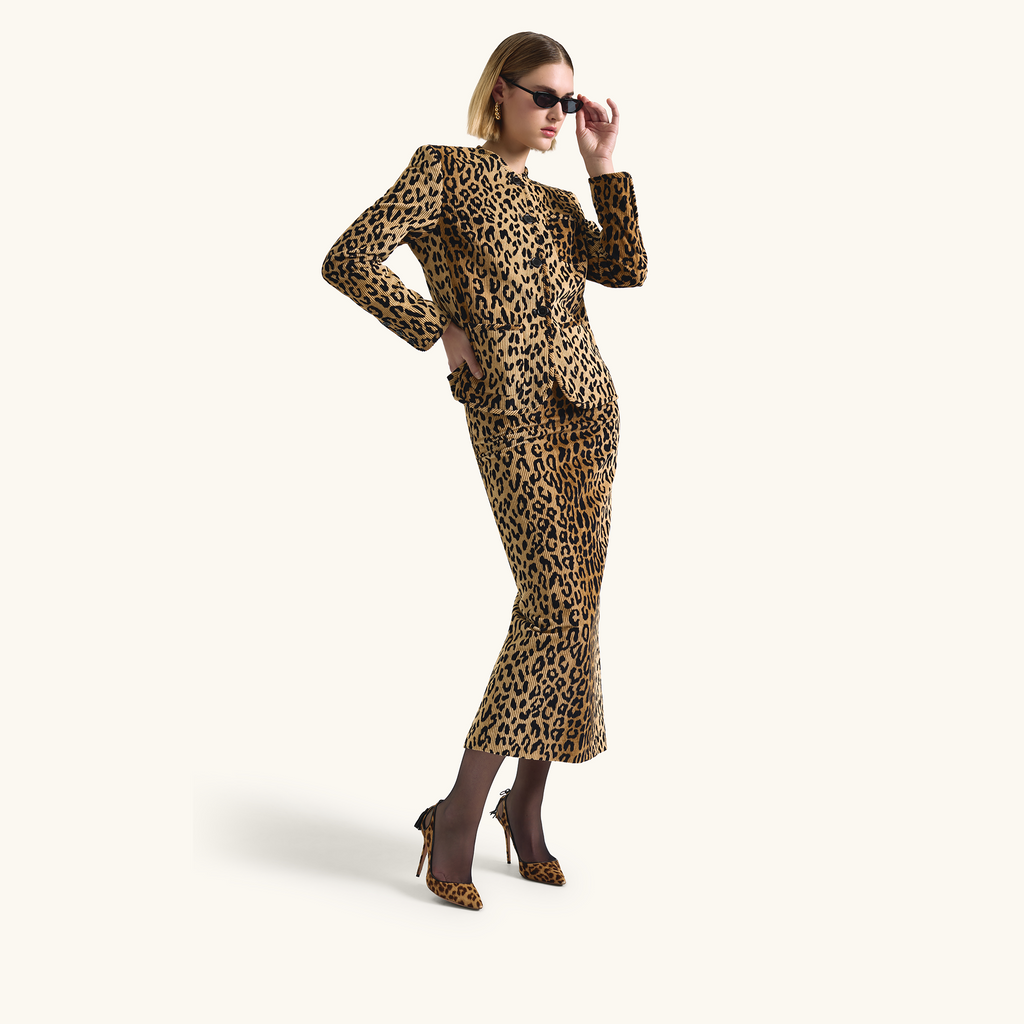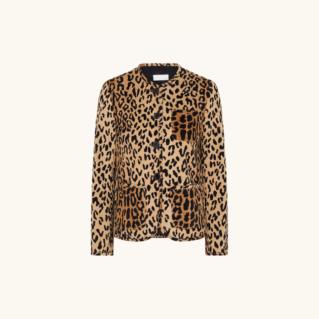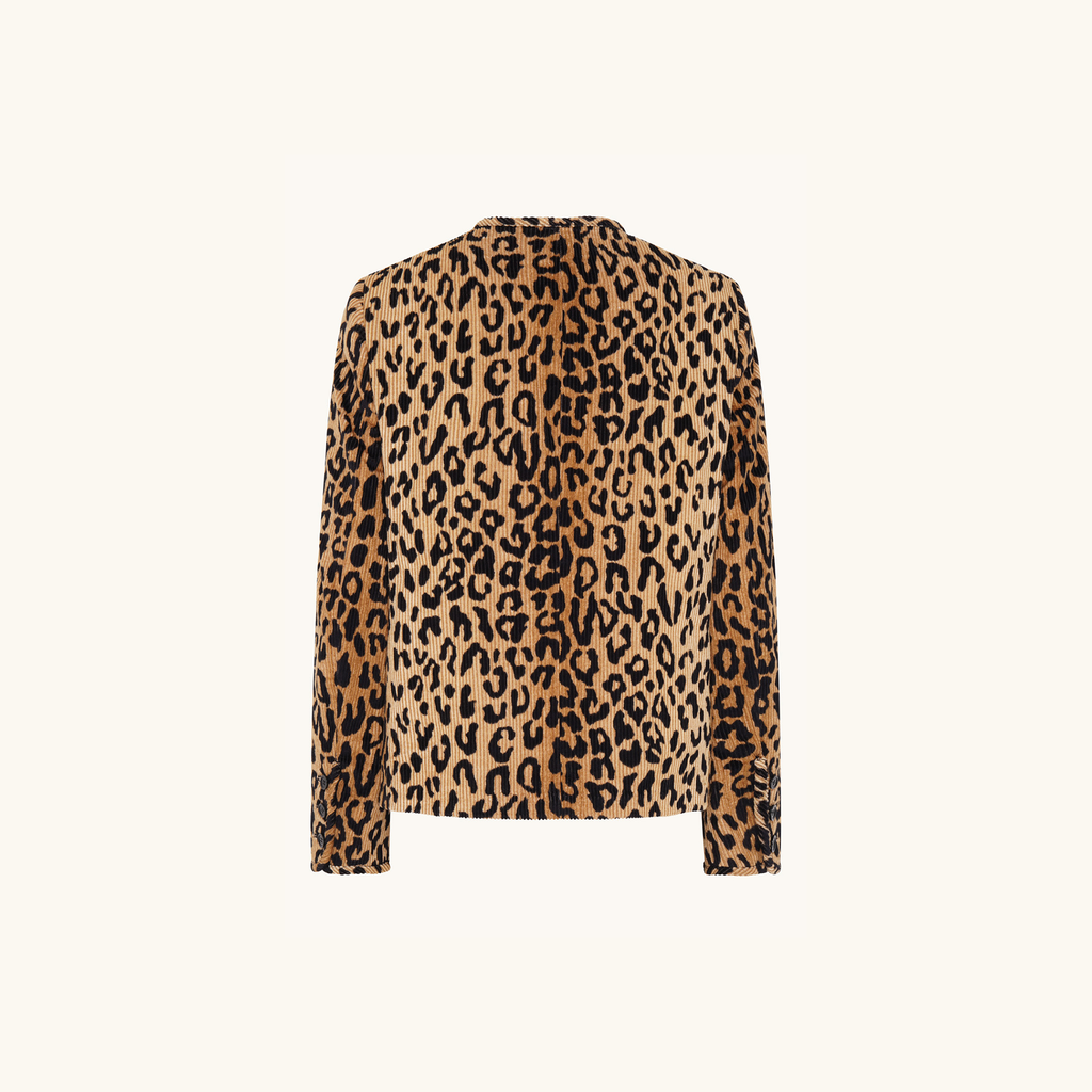 Designed with a round neckline and button-front closure, it features a straight fit with practical patch pockets. Crafted from soft corduroy in leopard print, it combines structure with a comfortable feel.