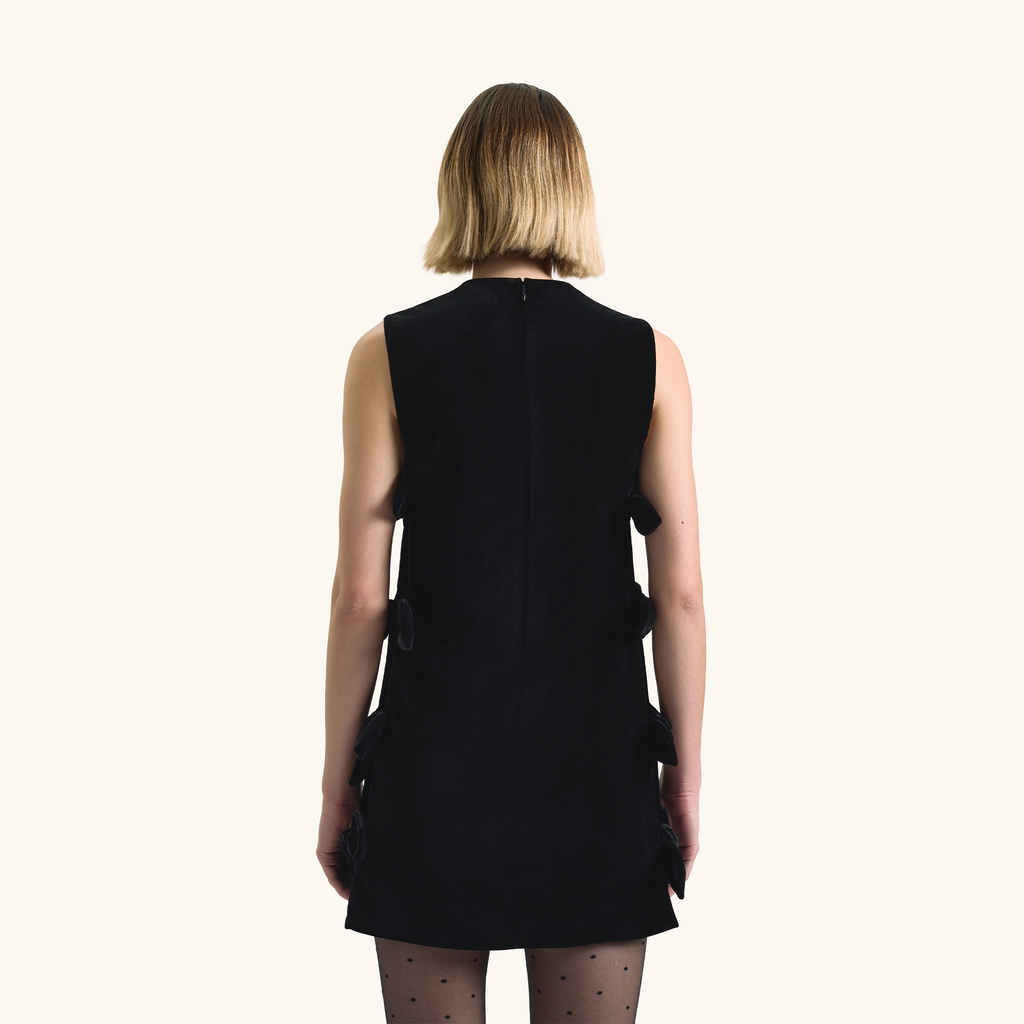 The MINI VERUSHKA Dress in black velvet reimagines our iconic bow tunic with a touch of evening allure. Crafted from plush velvet, it blends refined elegance with playful charm, creating a silhouette that’s both flattering and distinctive.