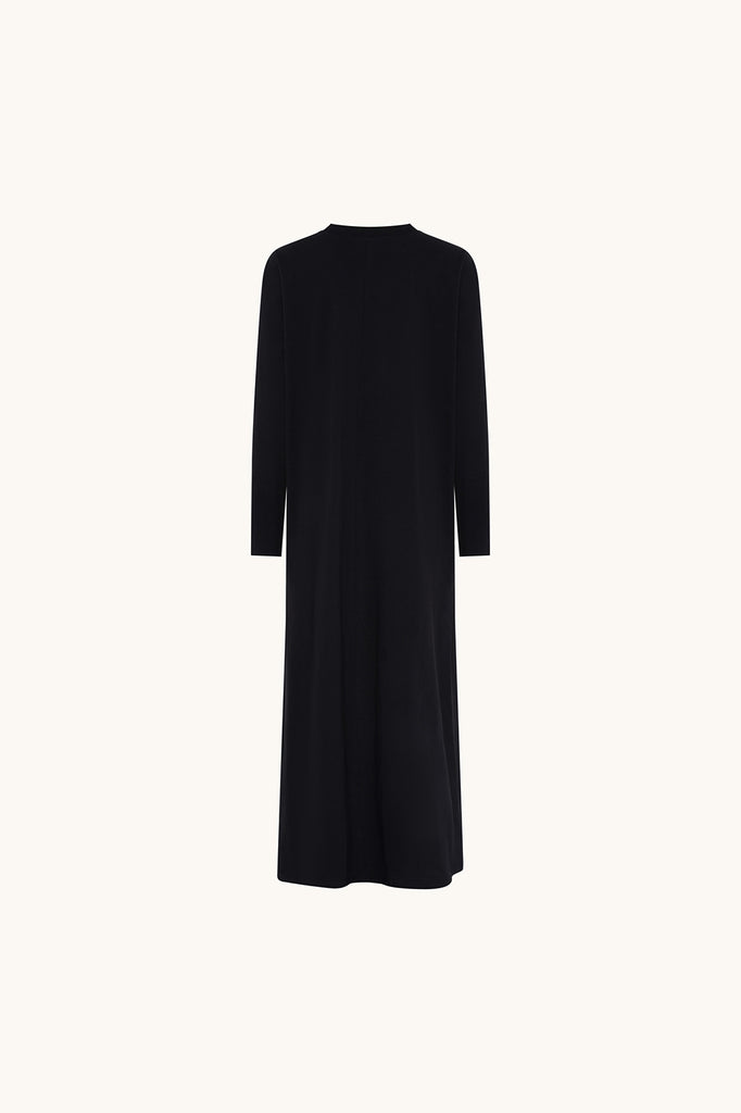 The SIENNA long-sleeve top in black offers a modern twist on the everyday T-shirt. Designed with a clean crew neckline and a cropped front detail, it provides a relaxed yet polished fit.